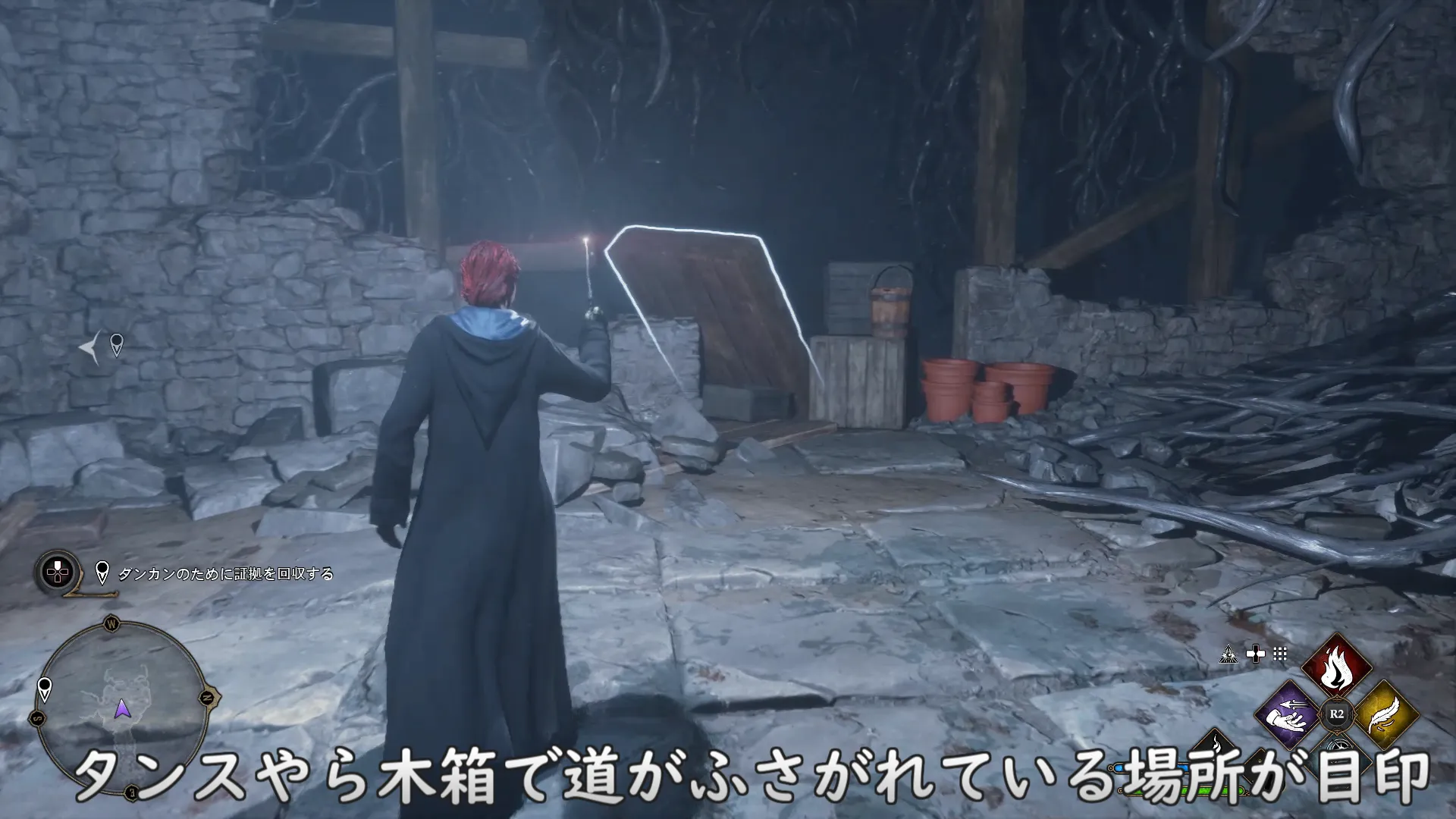 薬草学の隠し通路を見つけたら、インセンディオでツタを焼き尽くして廊下の中に入るとロードを挟み内部へと移動する。廊下内部では「悪魔の罠」という植物が至る所で生えており、接触するとダメージを受けてしまう特性を持っている。光に弱いのでルーモスで周囲を照らしながら先へ進もう。ちなみにルーモス以外にもインセンディオで悪魔の罠を退けることはできるが持続時間が短く、ルーモスと比べて暗いため、松明に火をつける目的以外に使用する用途はないだろう。