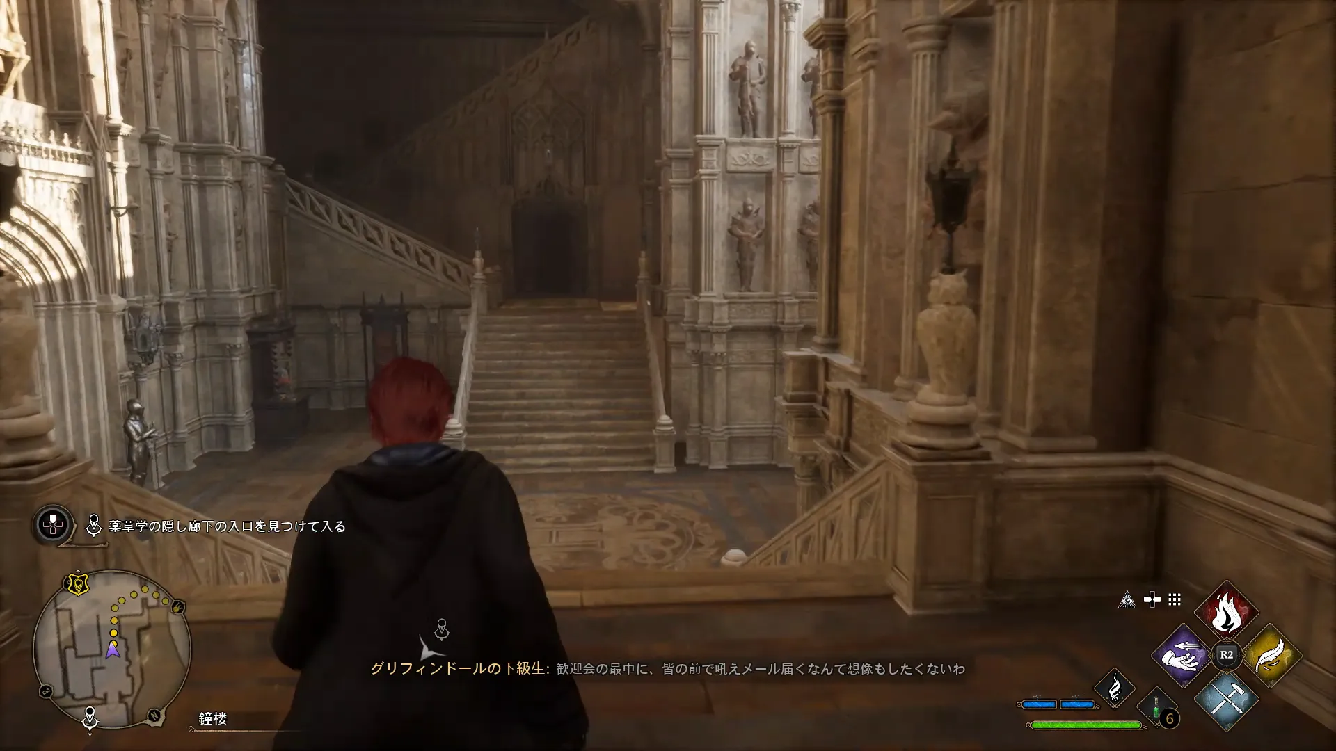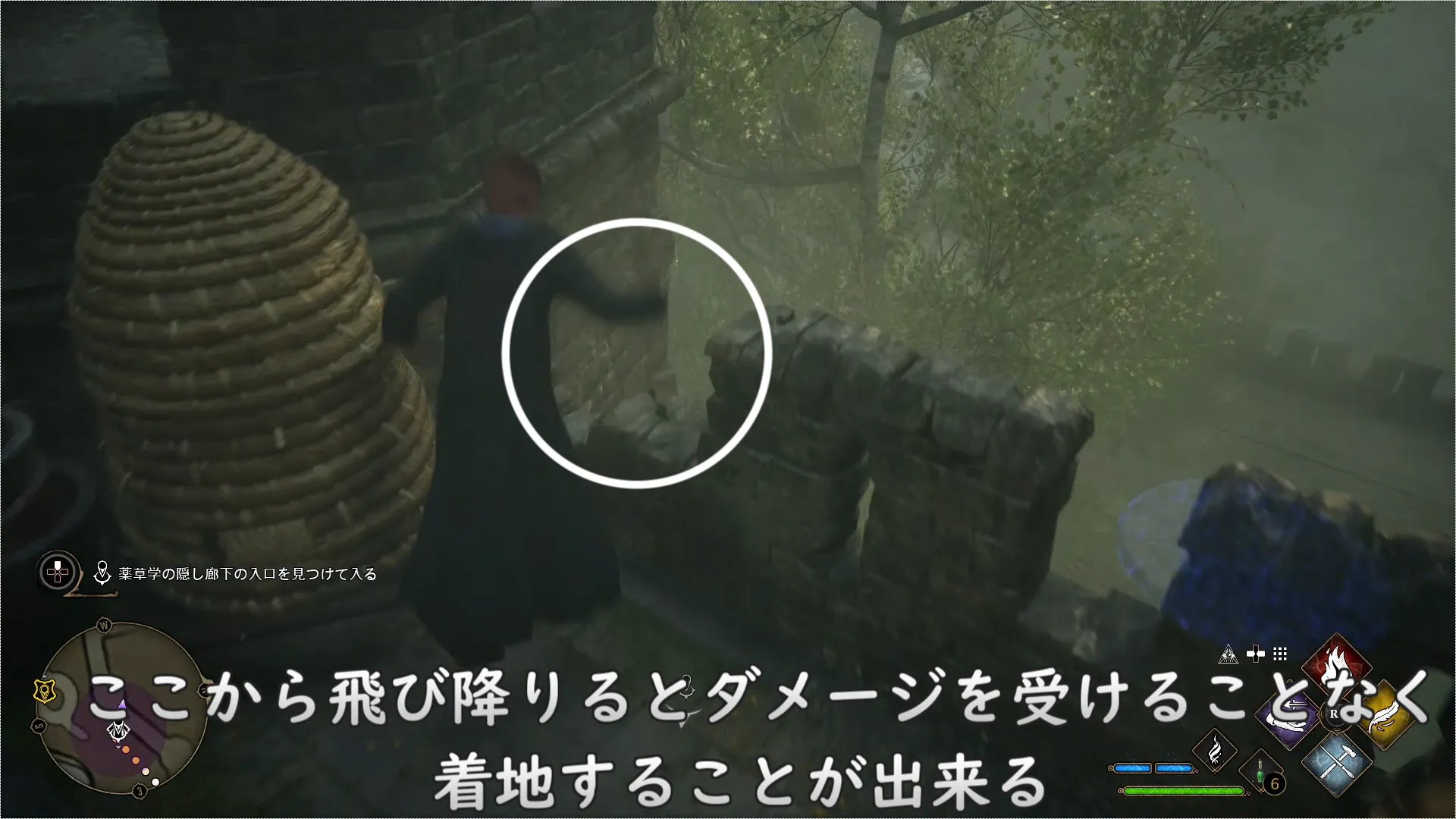隠し廊下の場所は、ホグズミードに行くときに「ナツィ・オナイ」もしくは「セバスチャン・サウロ」と待ち合わせをした望楼を出て、右下に向かうことで薬草学の中庭にたどり着くことができる。道中フィールドガイドが二つあるのでこの機に集めてしまってもいいだろう。