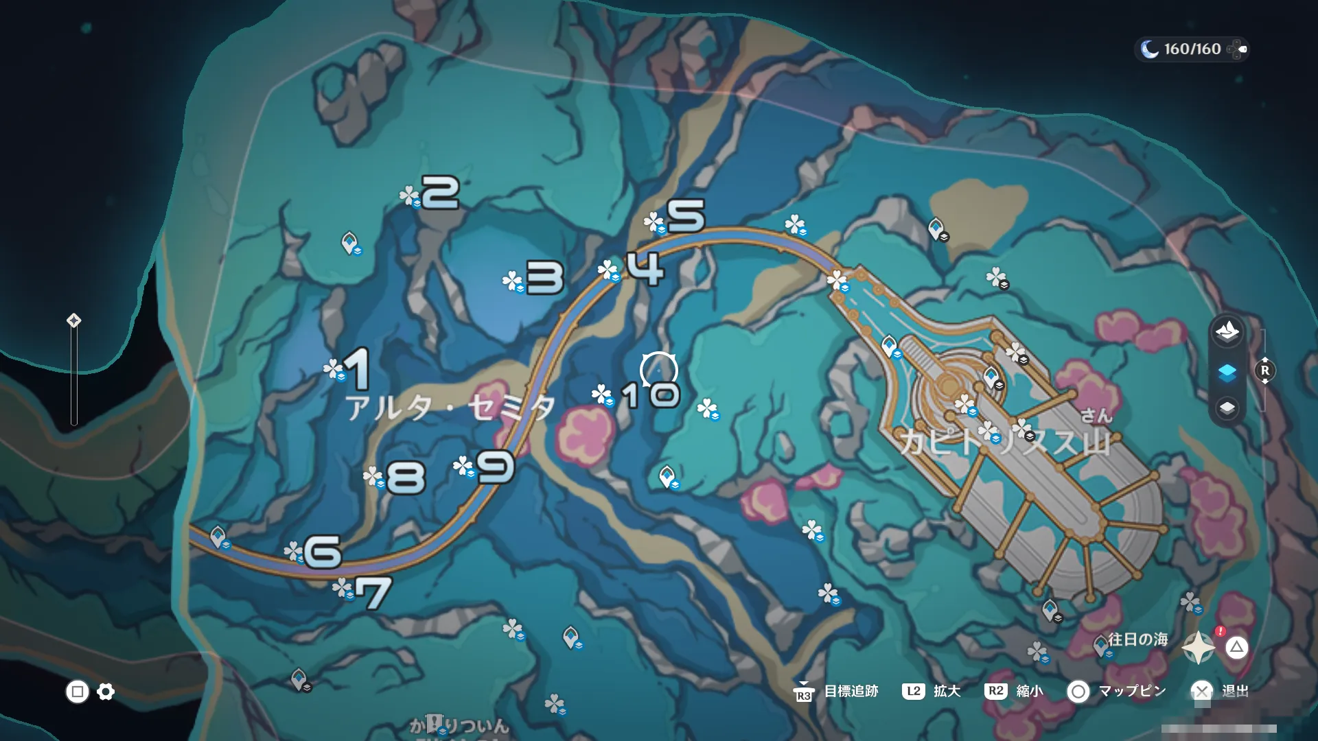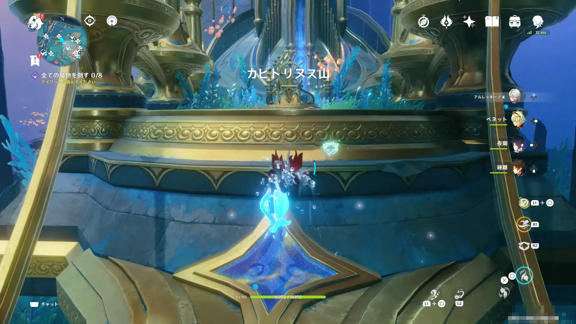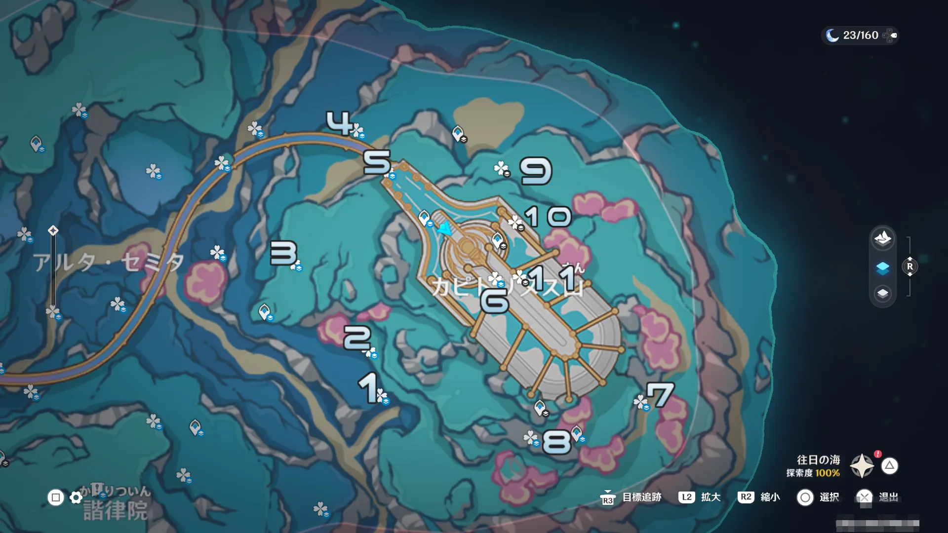 世界任務「諧律のカンティクル」の最後の舞台となる黄金の劇場がそびえたつ山「カピトリヌス山」この山の周辺には洞窟や劇場などの歩くことができるエリアには3つ、水中には8個の水神の瞳が配置されており、ここに置いてある、すべての水神の瞳を獲得するためには「諧律のカンティクル」を完遂する必要がある。