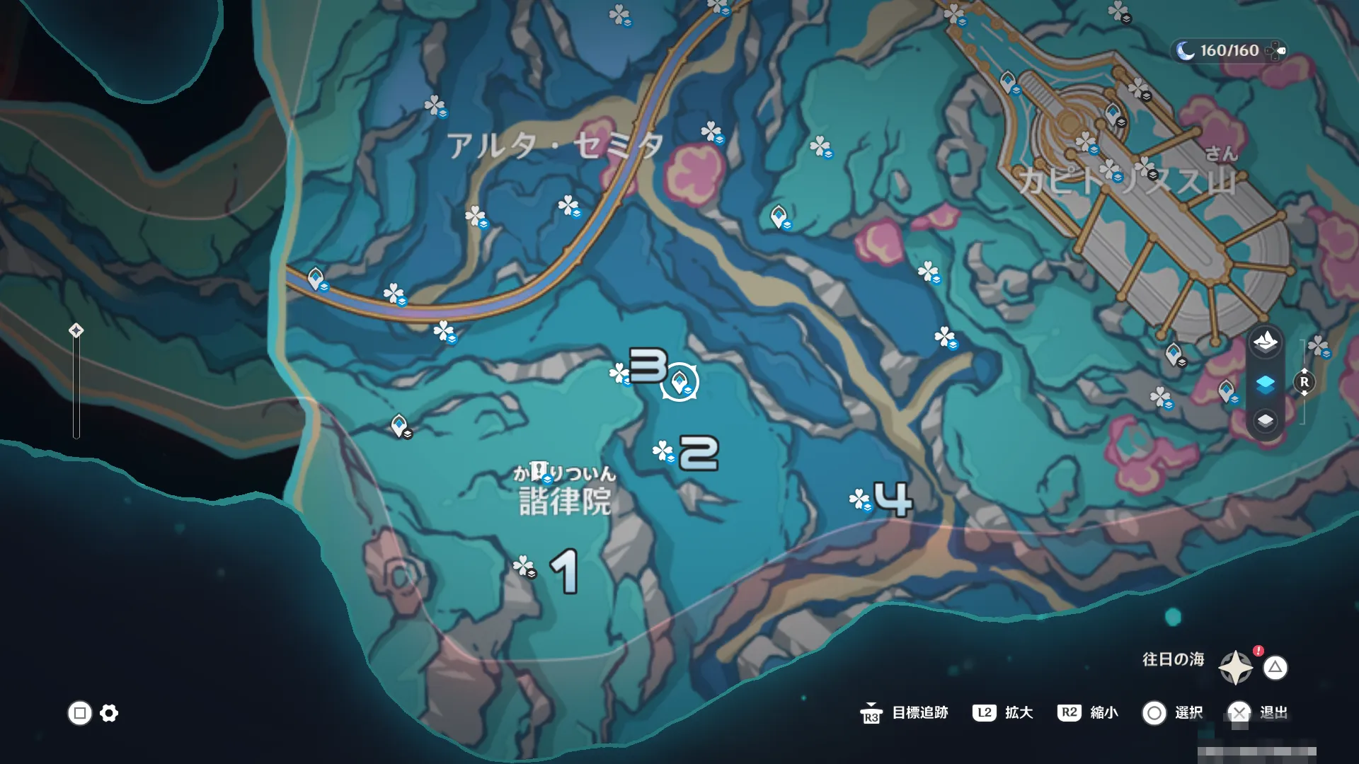 シリーズ世界任務「諧律のカンティクル」の往日の海の下にある封印された門を解放するために、数千年拘束されていたスキュラを解放していく必要がある。解放後会話を行い出発することでたどり着くことができる往日の海と比べてさらに広大なマップであり高低差も大きいマップ。通常の泳ぎでは時間がかかる為、スキュラが起こす激流によって素早く移動することができる。獲得できる水神の瞳の個数は「アルタ・セミタ」で10個「諧律院」に5個「カピトリヌス山」に11個の合計26個を獲得することができる。これらを含めた今までのフォンテーヌで実装された新エリアの水神の瞳をすべて集めると、七天神像がレベル10に到達することができるその反面今後フォンテーヌで実装される新エリアでは水神の瞳に代わるアイテムが配置されるようになる。これらは随時更新していきます。