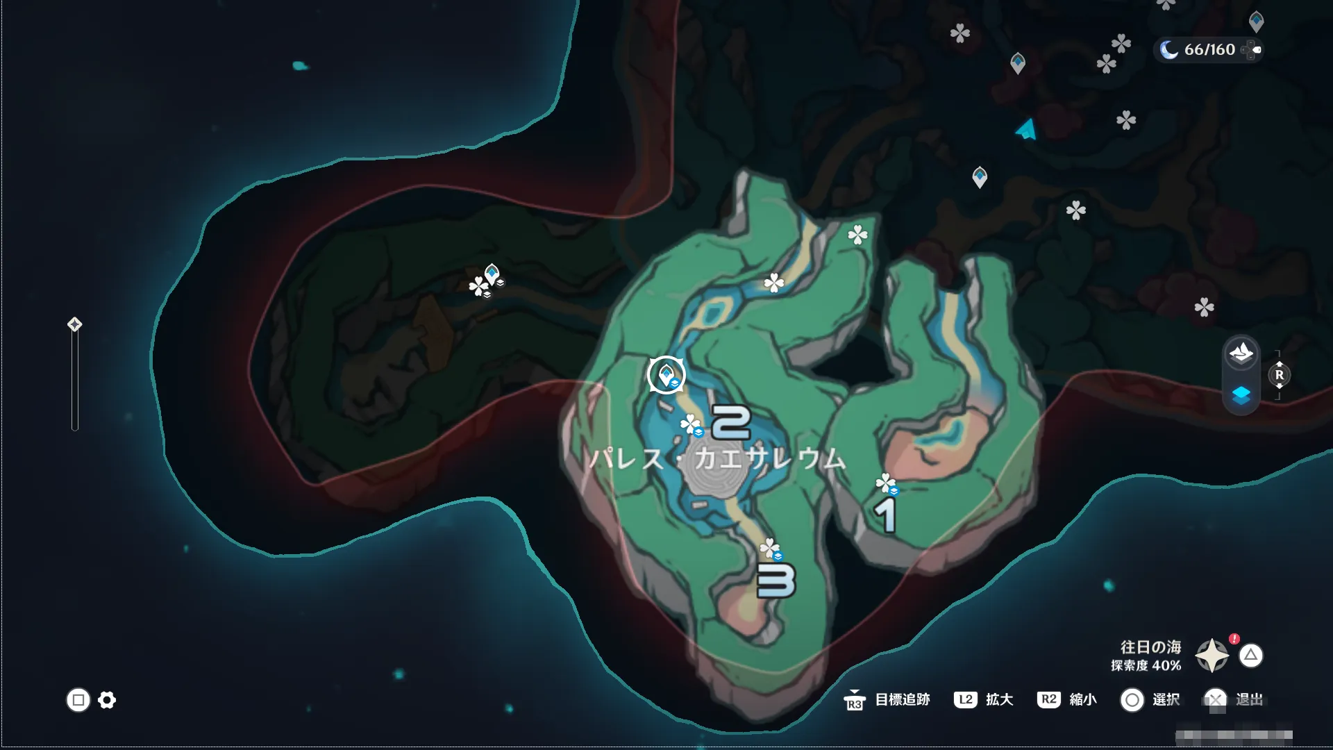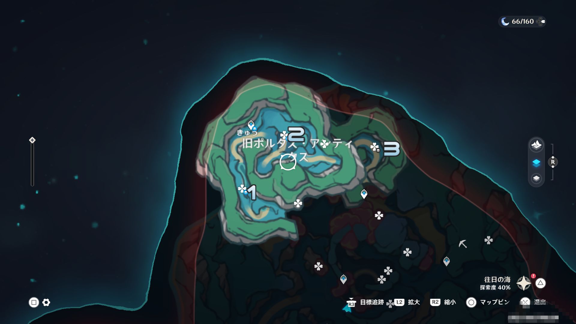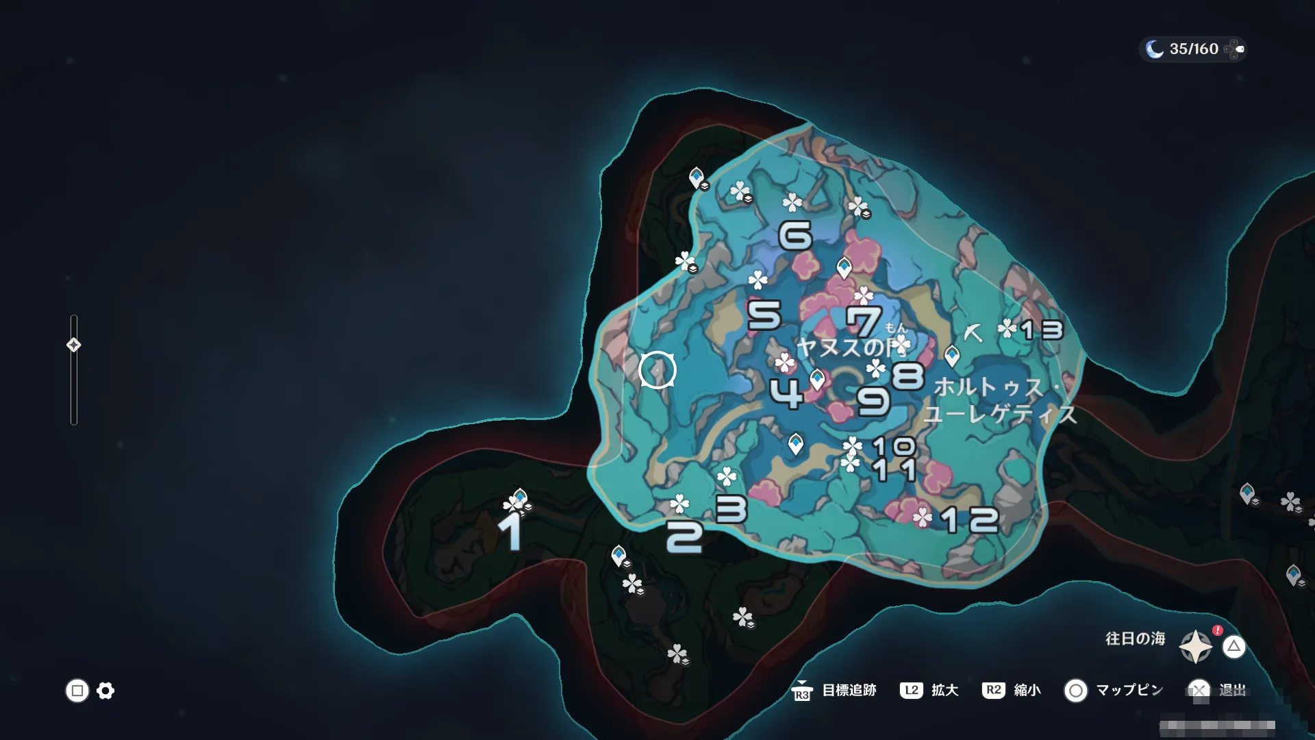ヤヌスの門とその東にあるホルトゥス・ユーレゲティス海域には13個の水神の瞳が配置されている。上のエリア範囲ぎりぎりの位置にあったりと上下の差が大きい場所にある。