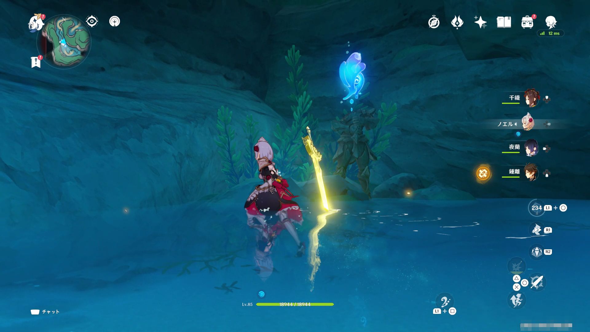 「往日の海」の北側にある洞窟エリア。パレス・カエサリウムと 同様、水面と陸地の境界線があり、歩くことができる。水神の瞳の個数は3つである。