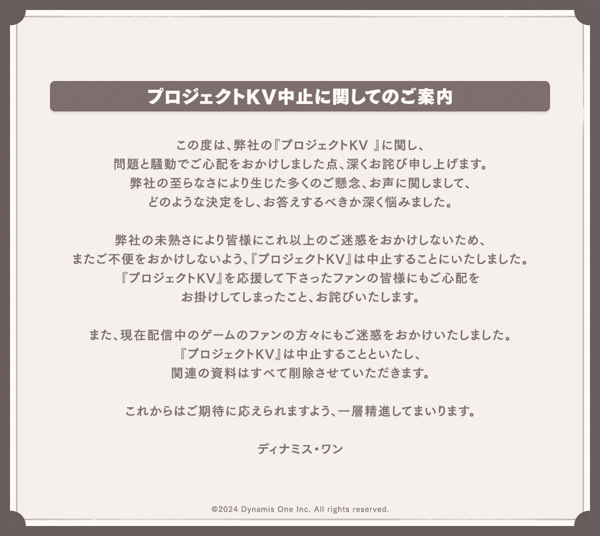 新会社Dynamis One(ディナミスワン)が抱えるゲームスタジオ「スタジオ・アラヤ」が先日発表した新作プロジェクト「プロジェクトKV」の開発を中止したことを発表した。開発スタッフはメインストーリーを担当するシナリオライターや、作品の人気キャラを担当するイラストレーターなど、ブルーアーカイブの中核を担うメンバーが退職後に企画されたゲームということで多くのユーザーたちが関心を持った企画であった。しかし公開された企画PVではブルーアーカイブの特徴である「幾何学模様の空と光輪、学園都市といった具合でまるでブルーアーカイブという作品の平行世界を彷彿させるキャラクターと、世界観が発表されたことでブルーアーカイブの外伝作品だと勘違いする人が少なくなかった。