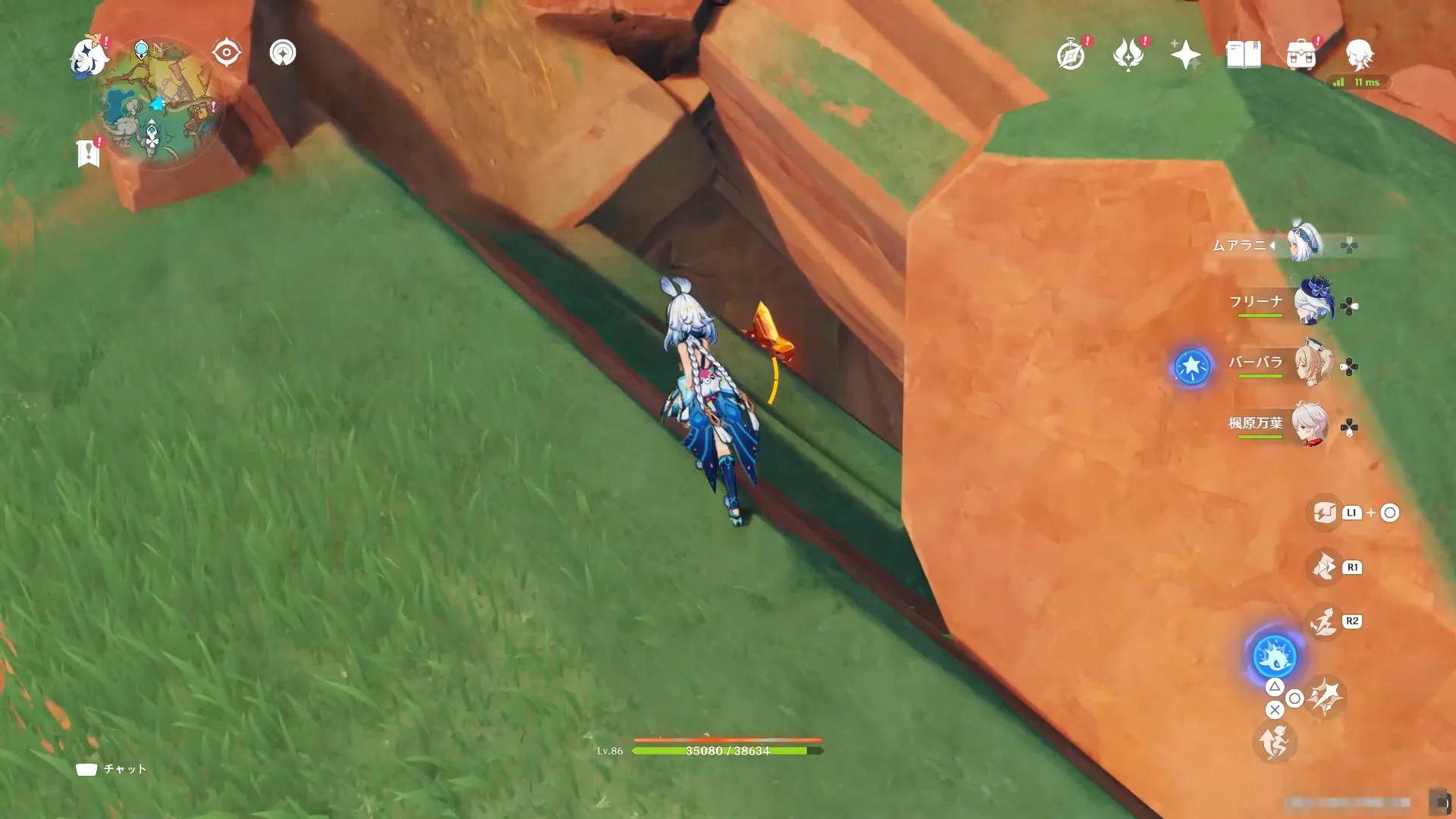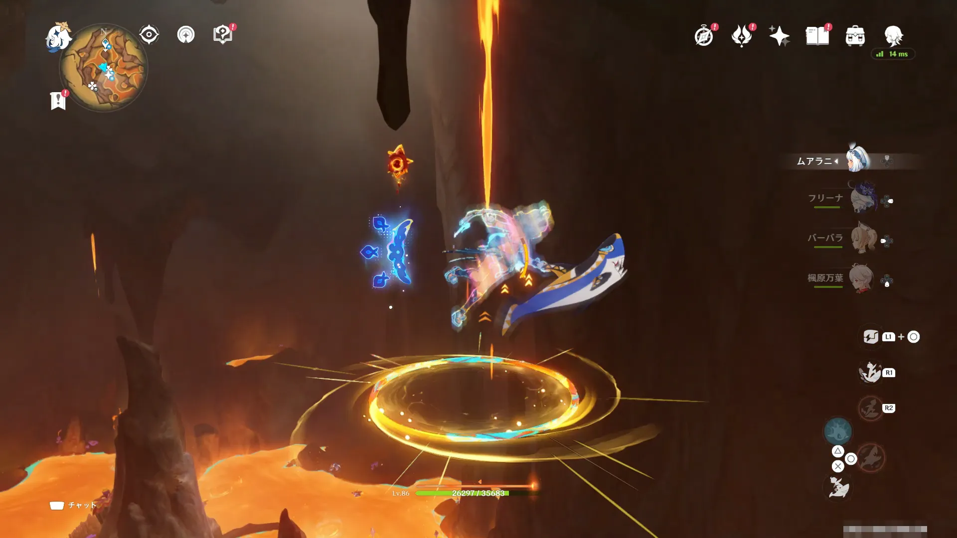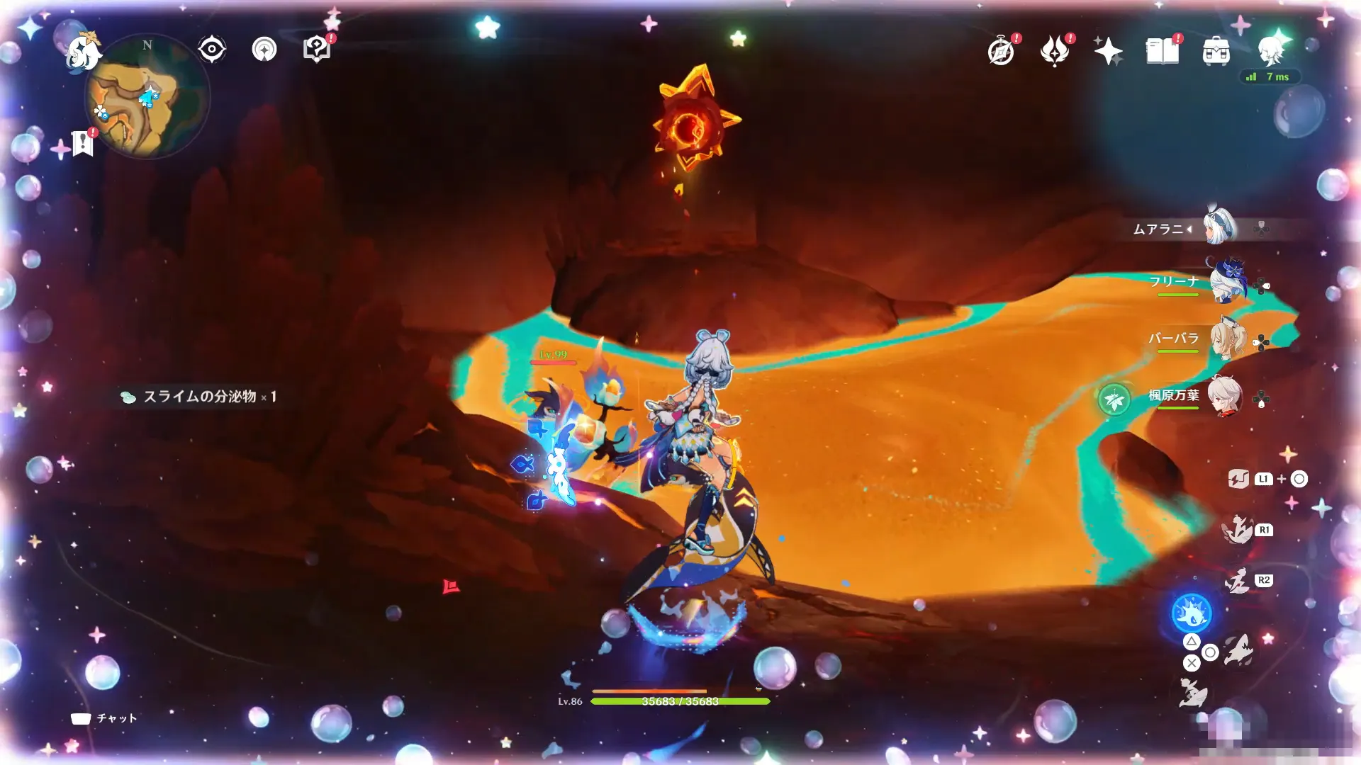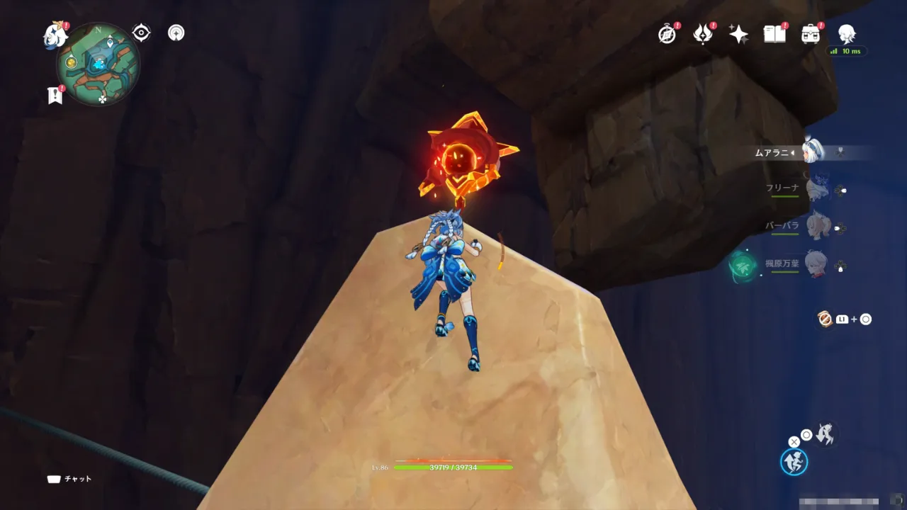 液体燃素があるエリアに入って左側の液体燃素が溜まっているエリアの上に浮いている。先ほどの液体燃素よりもさらに遠いところにあるので空中で移動できるキャラでも獲得後すぐにワープなどで戻らないと親指を立てることになる。ここは安全にムアラニの元素スキルや竜憑依で獲得しよう。