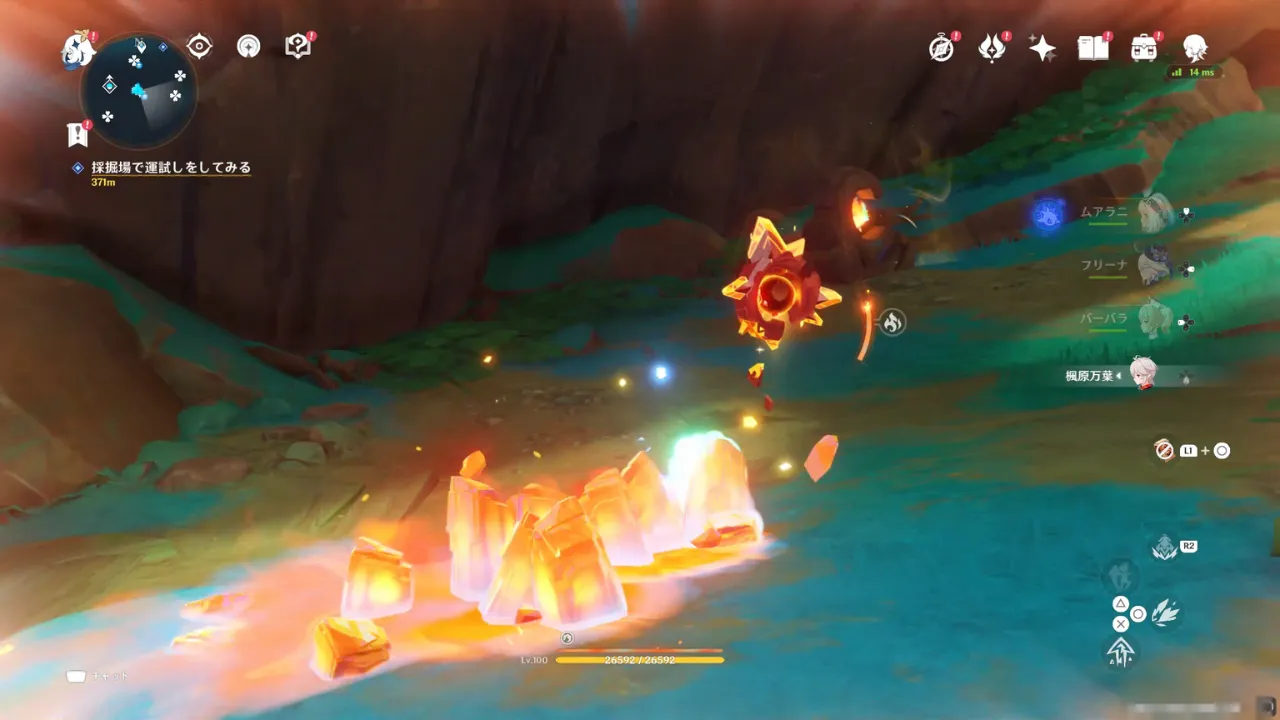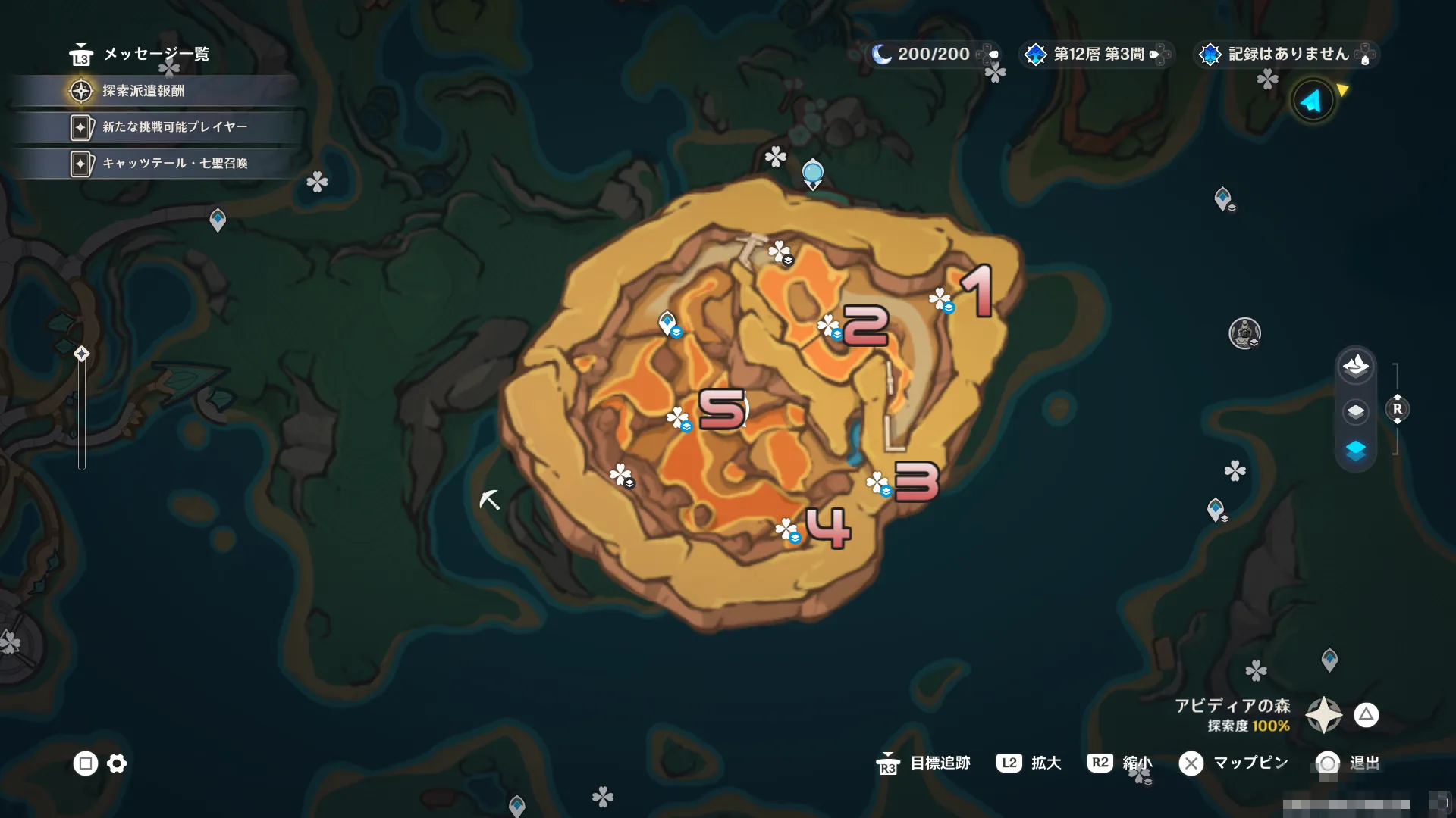 遺跡から進んだ先にあるギミックを解除していくことで地下エリアに到達することができる。世界任務「炎から夢を取り出す話」は進行ついでに解放されるため解放されたのならグルっと取ってしまおう。獲得できる炎神の瞳は5つである。