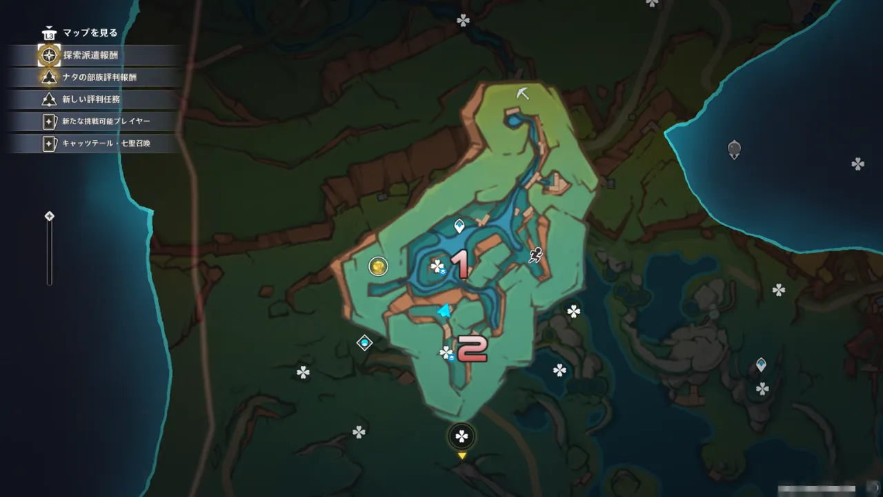 彩晶の頂との境にあるワープポイントの崖上にある取得するためには5.0後半で登場したキィニチの元素スキルは発動させるかユムカ竜の竜憑依で取得することができる。