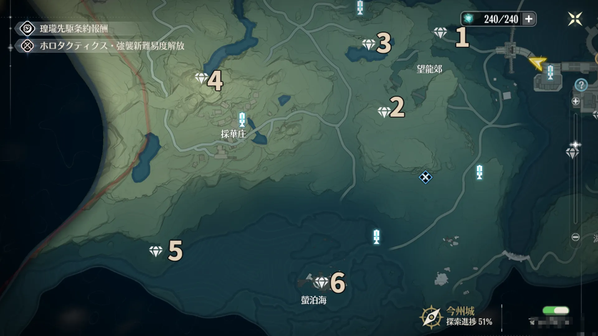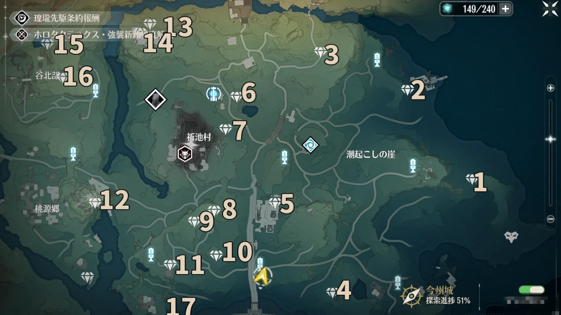 今州城から北に広がるエリア総数は17個と多く配置も高低差があり、操作に慣れていないと取得に時間がかかりやすいところに音匣が置いてある。