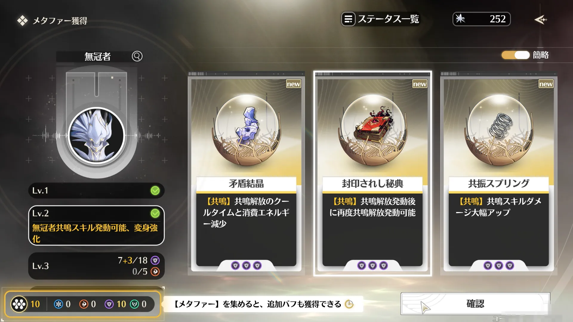 殲滅後、扉が開き深層空想秘境を挑戦できるようになる。もちろん最初の一回は回折主人公によるチュートリアルが入り、ランダムで決められた音骸を選択して戦うことになる。この音骸は特殊仕様で強化すると短時間だけボスキャラを操作できるように強化される。敵を倒したりステージに移行する時に操作キャラや音骸を強化することができるアイテムを選択することになる。このアイテムの属性と音骸が求める属性を取っていくことで音骸をさらに強化していくゲームだ。
